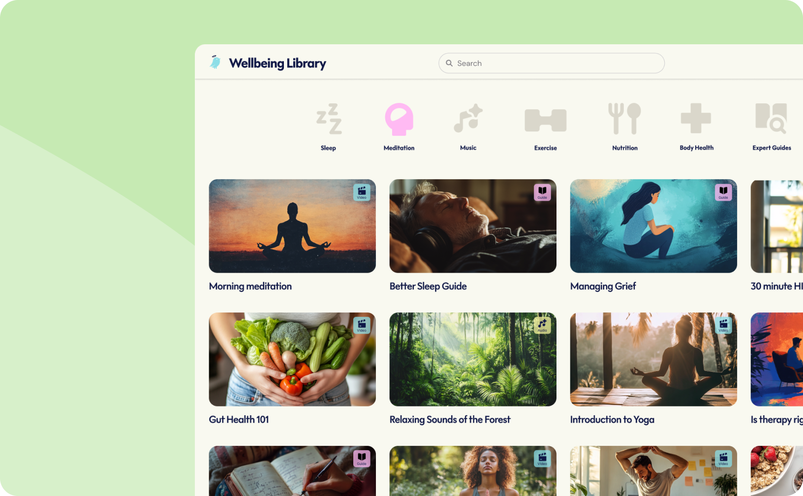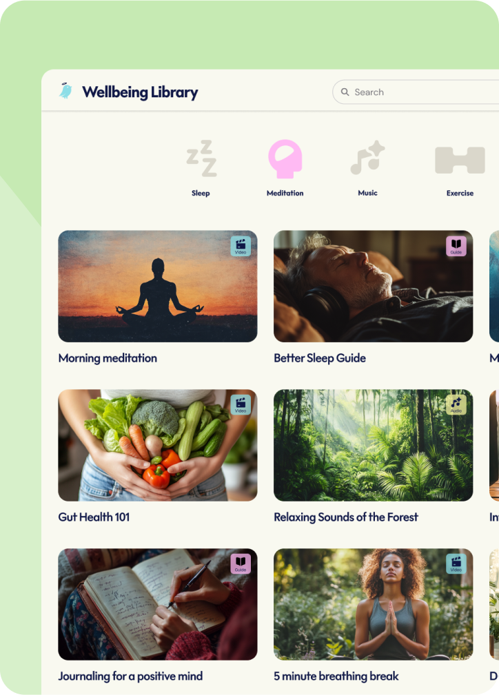 Your team get free access to our wellbeing library, packed with expert resources on meditation, exercise, nutrition, stress, and more.